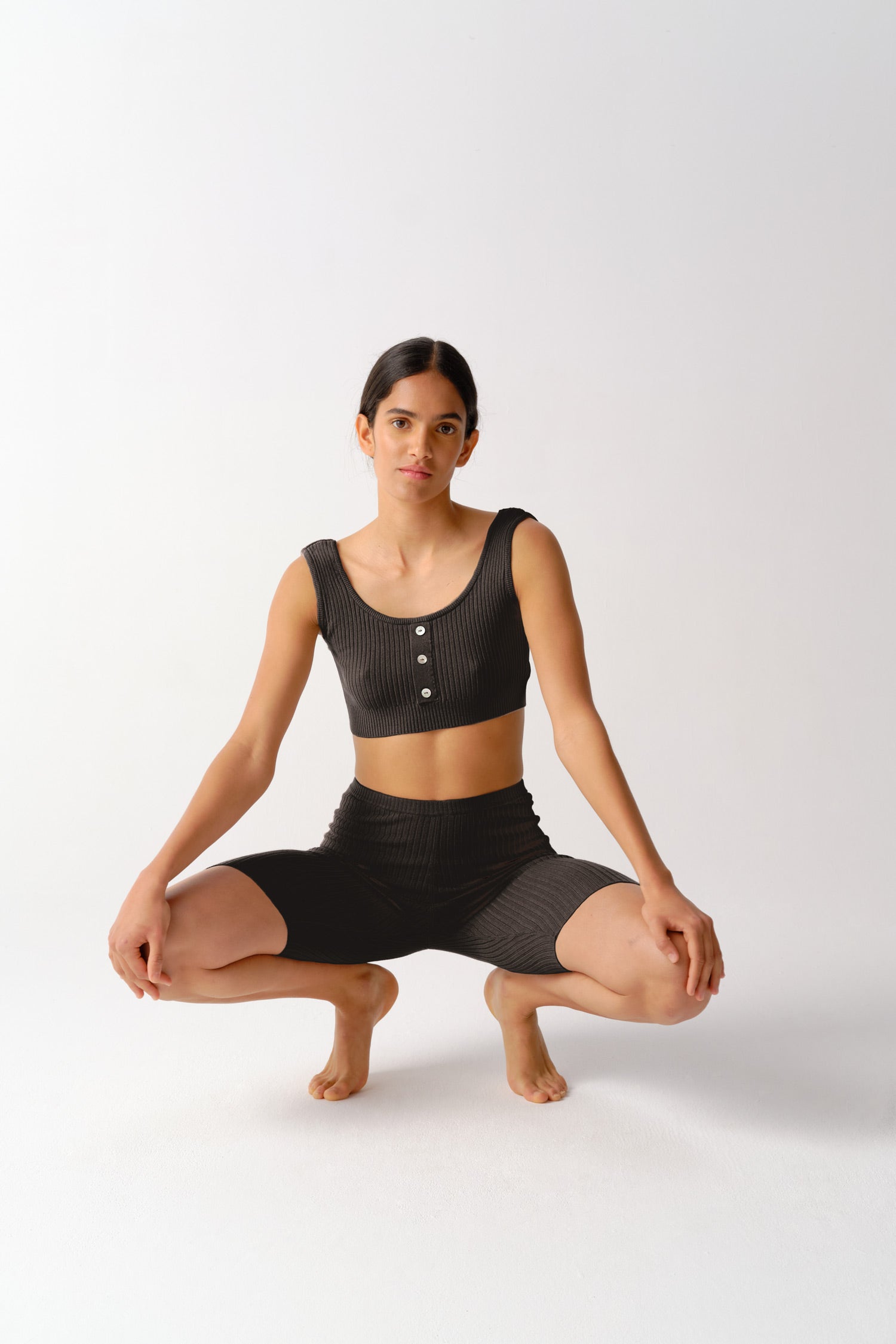 A sporty style intended for wearing everyday, outside with an oversized shirt or at your weekly yoga class. A comfortable shape, ribbed knit with elasticated waistband.