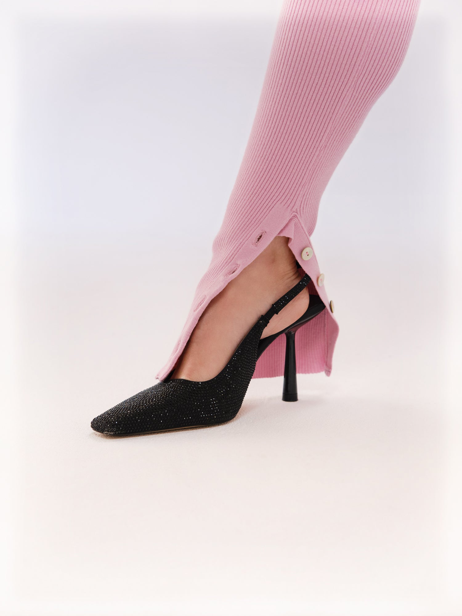 The Varda leggings are floor length and pair perfect with heels. Its buttoned detail at bottom offers a wide leg feature if opened. It is a luxurious and unique piece that works both with your favorite sneakers and in dressed-up occasions with heels.