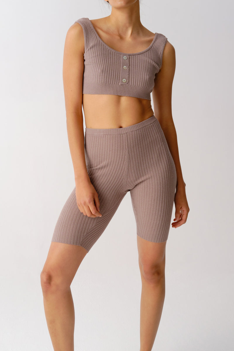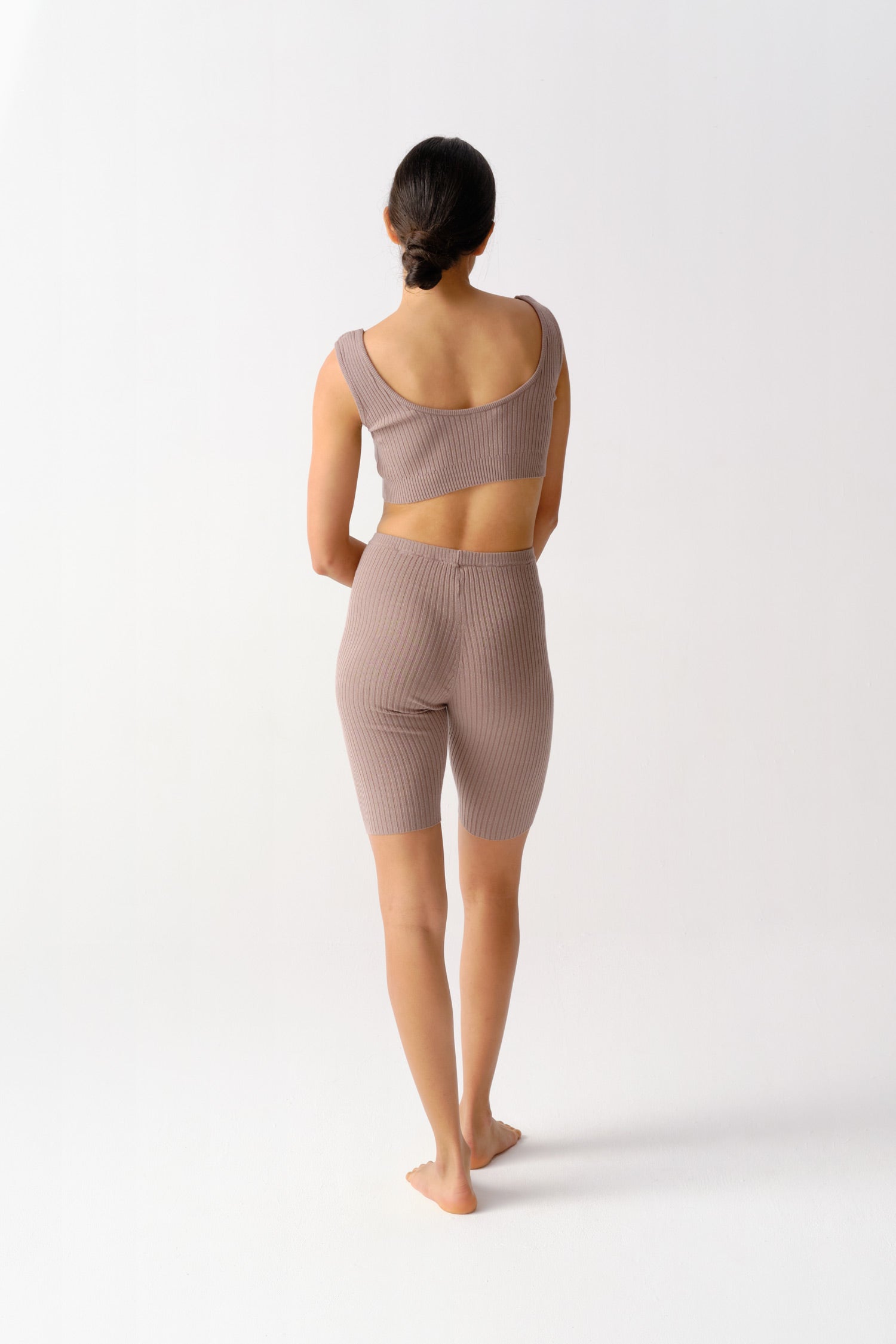 A sporty style intended for wearing everyday, outside with an oversized shirt or at your weekly yoga class. A comfortable shape, ribbed knit with elasticated waistband.